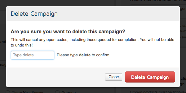 Confirm that you want to delete the campaign by typing 'delete' in the input box. Click the red Delete Campaign button.