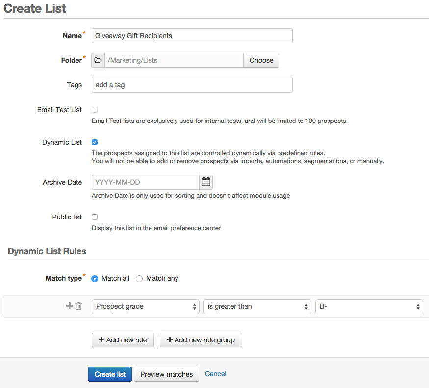 You can name this list something like Giveaway Gift Recipients, you'll also want to specify some rules via the Dynamic List option that clarifies what criteria prospects must match to receive a gift. See below for an example (all prospects with a grade of B- or better):