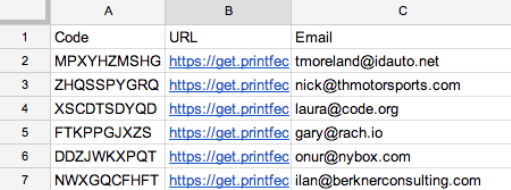 Create a new column for Gift Codes and Gift URLs, then copy in the codes and urls from the Printfection purchase_orders.csv file. Once done, save the CSV.