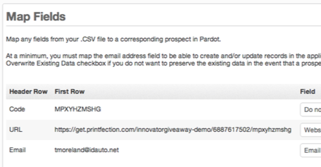 You'll now want to import the CSV with the Prospect details and Gift Codes into Pardot, do this from the Admin > Import > Prospects menu option.