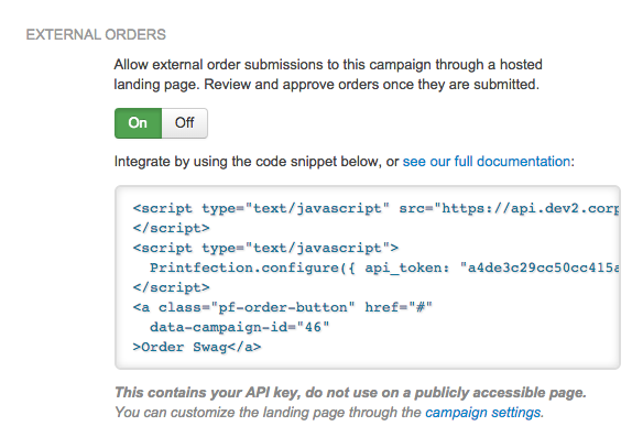 Make sure your API Token and Campaign ID in the above code example have been filled with your actual API Token from your account and the related campaign id (located at the end of the URL for your Collection campaign, i.e.: printfection.com/account/campaign/overview.php?storeid=123456).