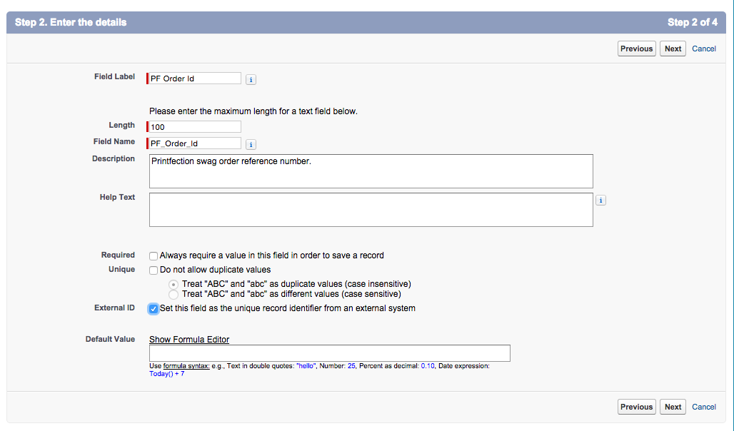Under the object's menu choose the Custom Fields navigation item and create a new field named: PF_Order_Id (Note: it's important to match this name exactly). Make sure the field is Text and has a length over 20 characters. You'll also want to mark the field as an External ID for reference in the future.