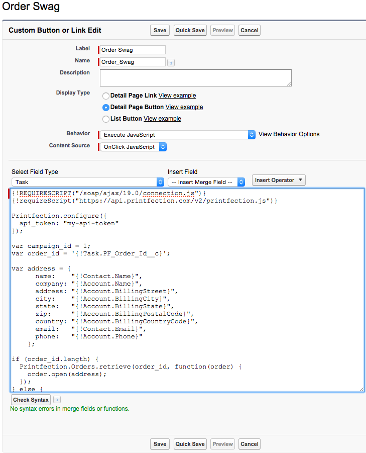 Click it and you'll see a new Printfection order pop-up with the relevant Salesforce contact and account info.