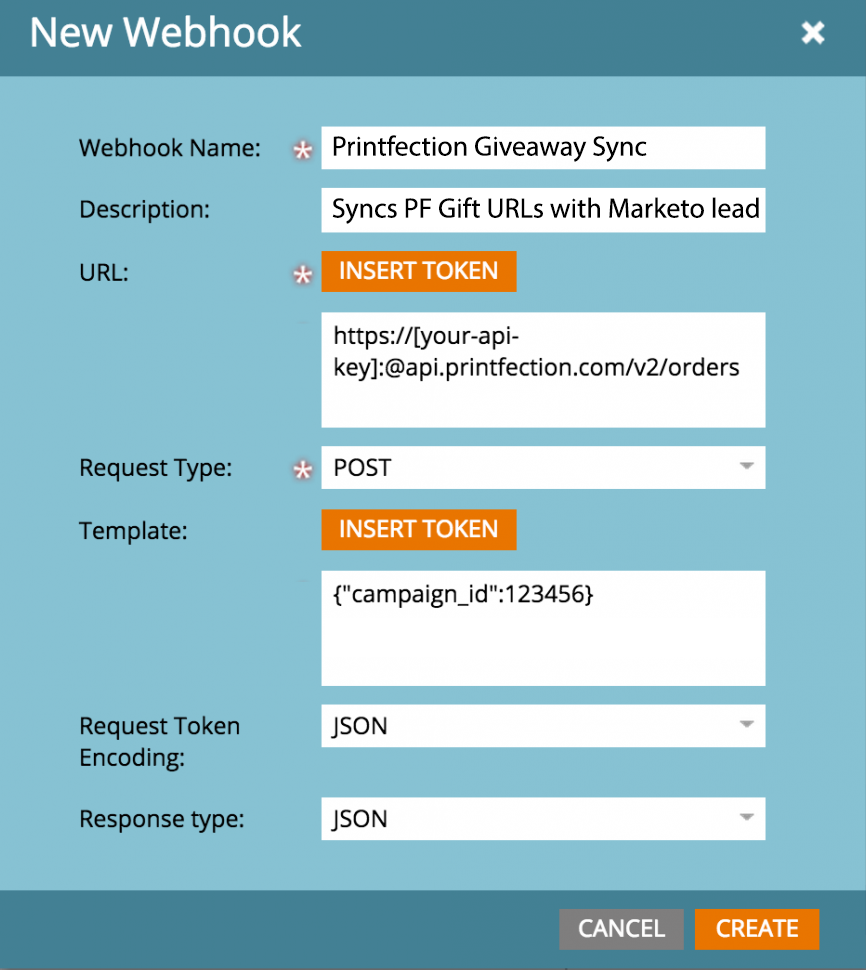 Next you'll want to build a Marketo Webhook that can hit the Printfection API and return JSON of your Giveaway Gift URL.
