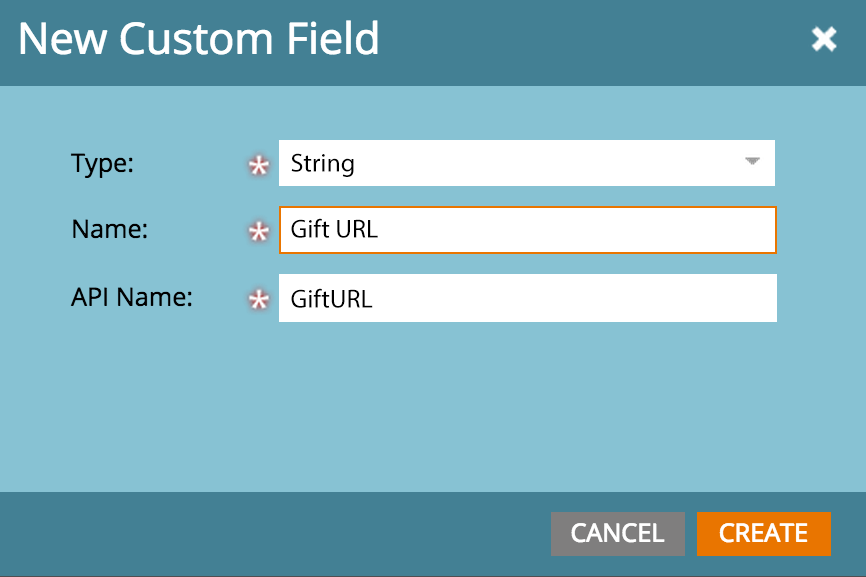 Go to Admin > Field Management > New Custom Field and choose the 'String' field type. Name the field something memorable such as 'Gift URL'.